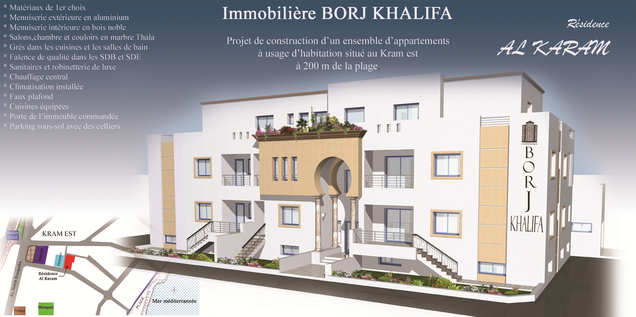 Projet El Karam, est un projet de construction d'un ensemble d'appartements Haut standing, contemporains et raffinés à usage d'habitation, situé au Kram, à 200m de la plage.