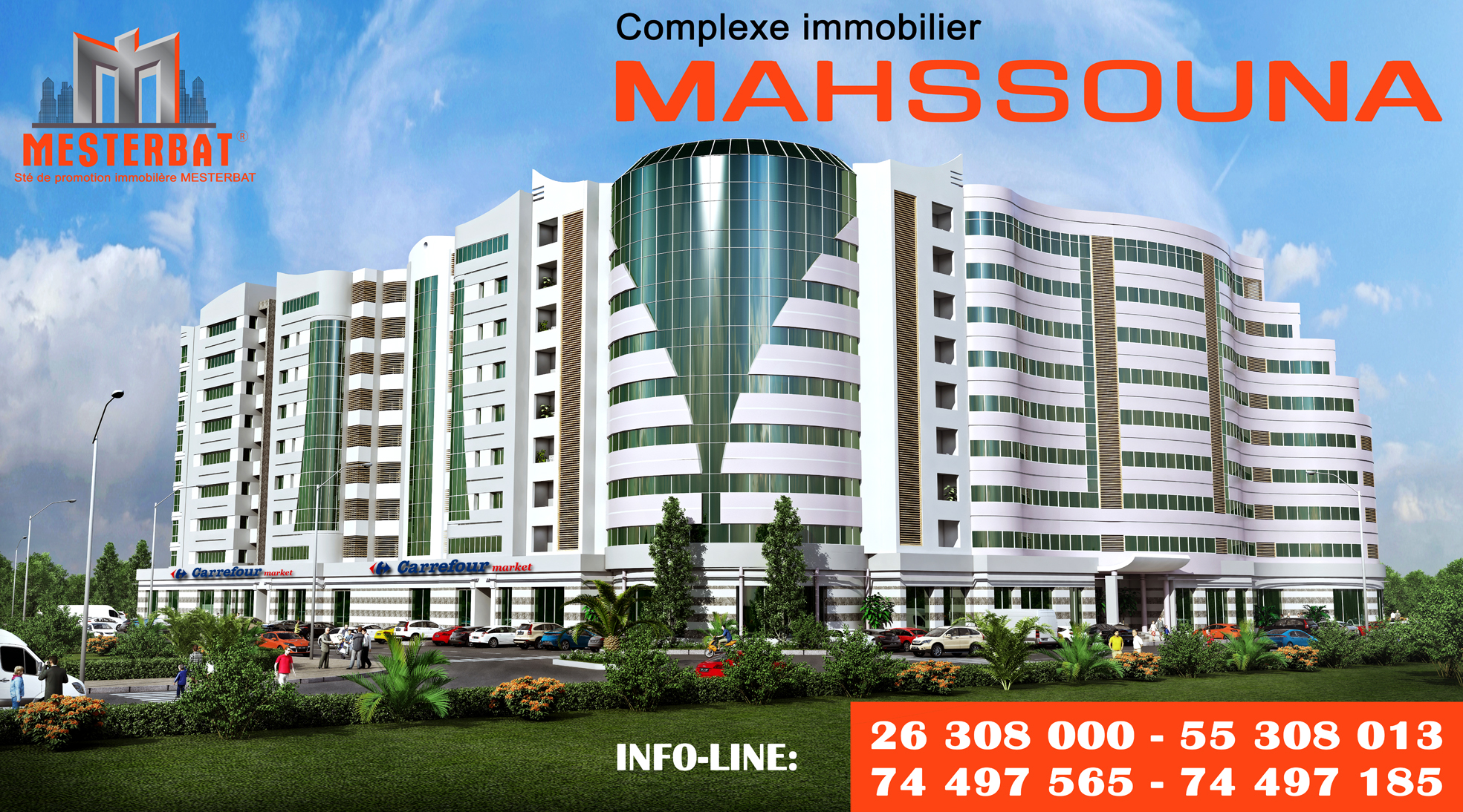 Le complexe immobilier « MAHSSOUNA» est un espace résidentiel et commercial  ;il comprend carrefour market magazin et boutique sur galerie commerciale interne climatisee appartement de tres haut standing s+1/s+2/s+3...