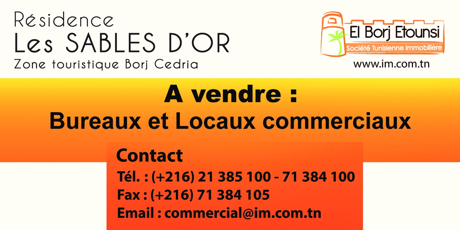 La société tunisienne et immobilière « EL BORJ ETOUNSI » vous propose une élégante résidence « Les Sables d’or » dans la zone touristique de Borj Cedria. Elle s’élève sur deux niveaux disposant tous d’ouvertures généreuses, balcons et terrasses, offrant ainsi des vues imprenables sur mer.