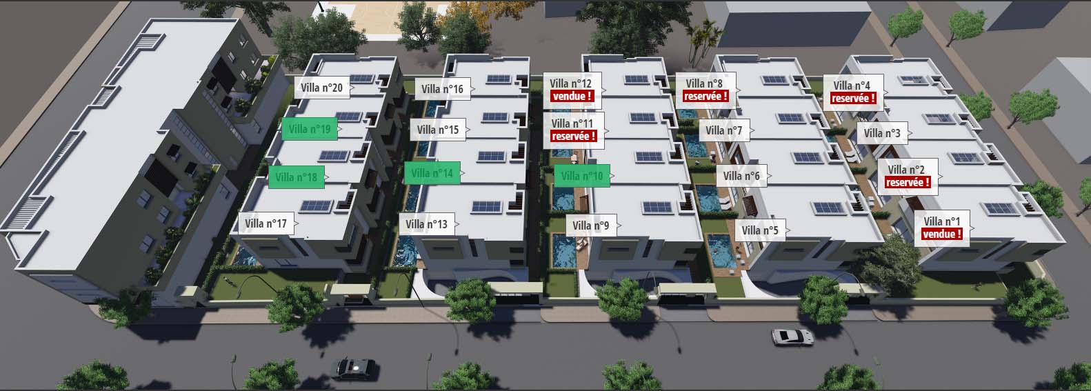 -Les villas sont de type R+1 avec inter-sol privatif offrant deux places de parking et une aire de vie aménageable au souhait du client.